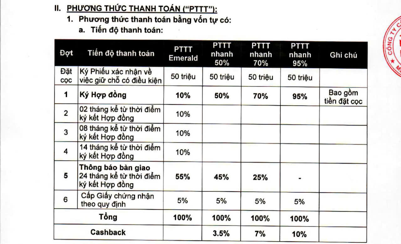- Trả lãi 12%/năm trên số tiền Booking trong trường hợp không tiến hành ký HĐ do nhiều nguyên nhân như hết quỹ căn..