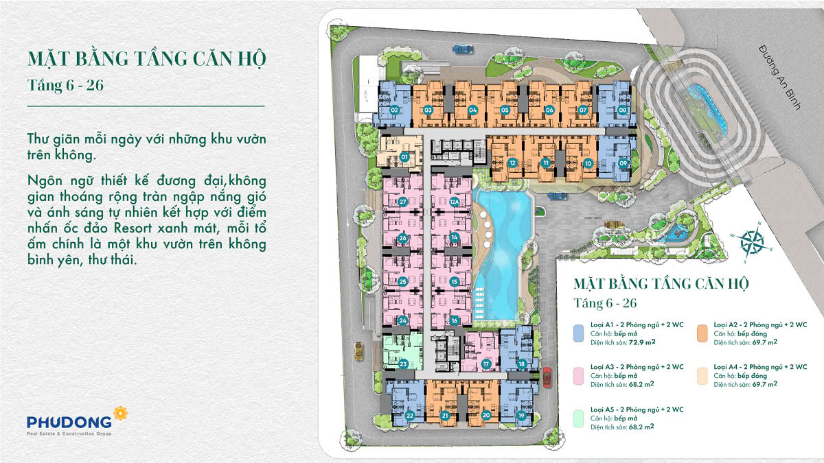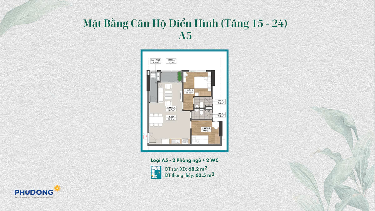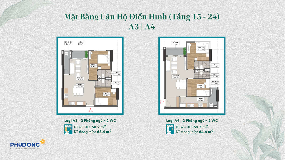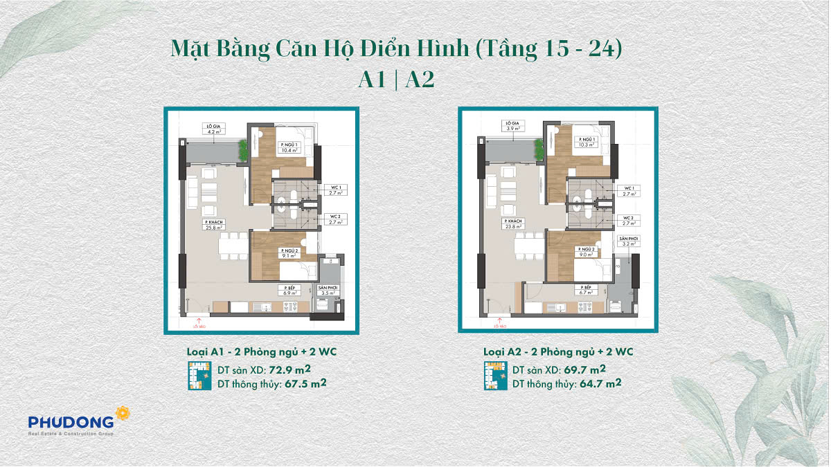 - 640 căn hộ 2PN 2WC diện tích từ 68.2 m2 đến 72.9 m2