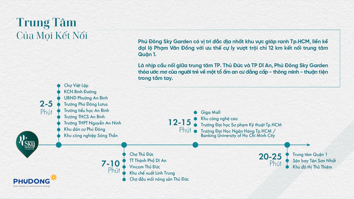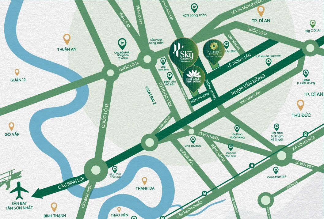 Tọa lạc ngay nút giao Phạm Văn Đồng (Tp Thủ Đức) và Quốc lộ 1A, căn hộ Phú Đông Sky Garden sở hữu cho mình vị trí cực kỳ đắc địa và chiến lược. Từ dự án dễ dàng giao thương kết nối đến: