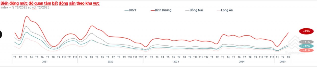 Dữ liệu từ thị trường cũng cho thấy mức độ quan tâm và giao dịch tại khu vực này đang phục hồi, đặc biệt ở các khu vực giáp ranh TP. Hồ Chí Minh như Thuận An. Lượng tìm kiếm bất động sản tại Bình Dương trong tháng 3/2025 tăng 49% so với tháng 2/2025. Đây là mức tăng mạnh nhất trong khu vực ven TP. Hồ Chí Minh.